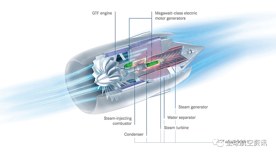 在亞音速領(lǐng)域,空客公司還與普惠公司和MTU航空發(fā)動(dòng)機(jī)公司合作,參與歐洲“清潔航空”研究計(jì)劃下的另一個(gè)先進(jìn)推進(jìn)項(xiàng)目Switch。Switch的目標(biāo)是在21世紀(jì)30年代中期投入使用,目標(biāo)是減少25%的二氧化碳排放,減少80%的氮氧化物排放,并減少不明原因的尾跡排放。在WET概念下,從廢氣中收集水,并使用熱交換器將水蒸發(fā)成蒸汽。蒸汽被注入燃燒室,從而提高了燃料效率。